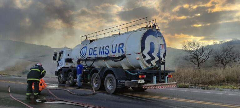 A carreta pegou fogo logo após o tombamento e foi totalmente consumida pelas chamas. Um caminhão do Demsur auxiliou os bombeiros no combate.