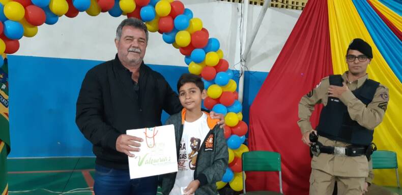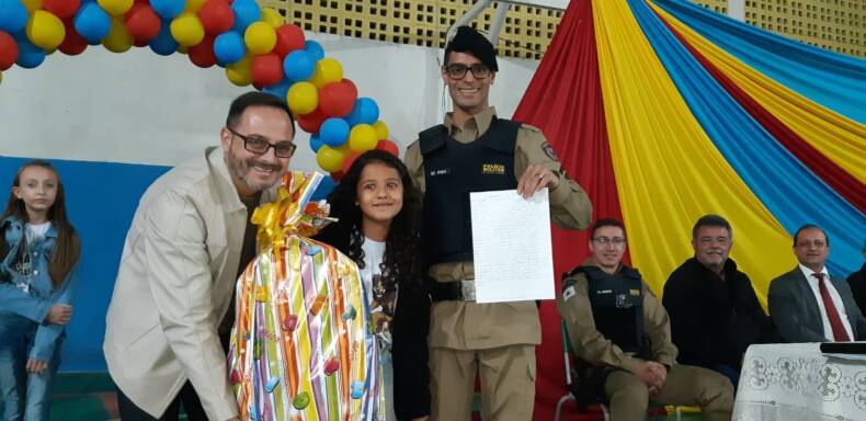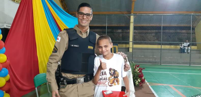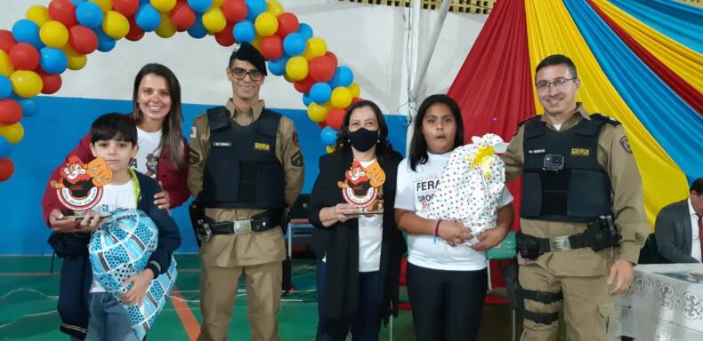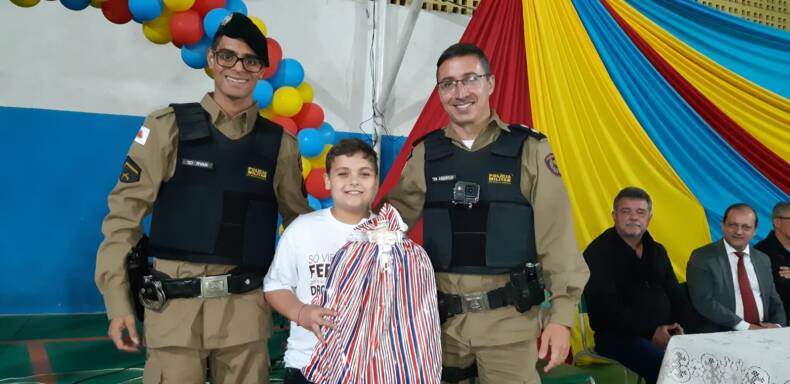 Como forma de reconhecer o bom comportamento, o comprometimento com as atividades propostas, bem como premiar aquele aluno que se destacou ao longo do programa – Proerd, foram entregues aos alunos o troféu proerdiano NOTA 10, os alunos: Maria Clara Alves, da Escola Municipal Desembargador Alberto Luz e aluno Antônio Pedro de Oliveira Campo, da Escola Municipal Doutor Olavo Tostes. No final os proerdianos receberam a visita do amigão da garotada, o mascote do Proerd – Darem.