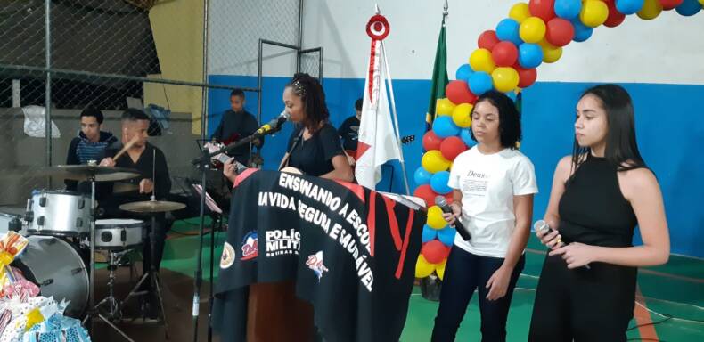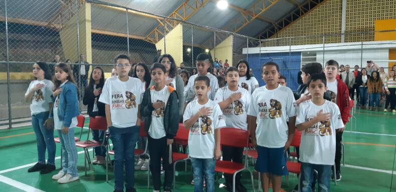 A formatura do Proerd – Programa Educacional de Resistência às Drogas reuniu, na noite desta terça-feira, dia 28 junho, na Quadra da Escola Municipal Doutor Olavo Tostes, cerca de 70 crianças do 5º ano.