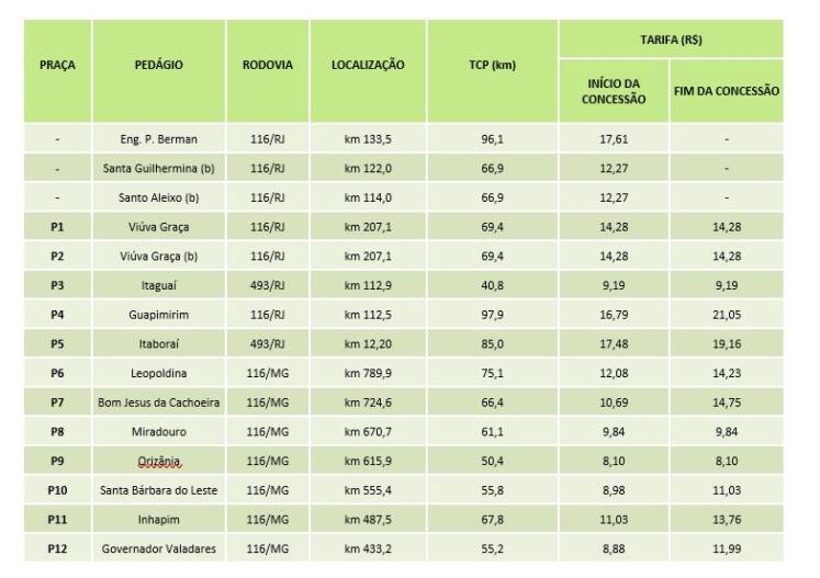 De acordo com o contrato, está prevista uma redução progressiva nas tarifas de pedágio instalados em toda a extensão do sistema rodoviário. No total, serão 12 praças, cinco no Rio de Janeiro e sete em Minas Gerais.