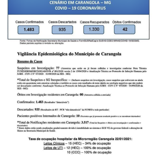 A Prefeitura de Miradouro, por meio da Secretaria Municipal de Saúde, informa o boletim epidemiológico, desta sexta-feira (22/01/2021).