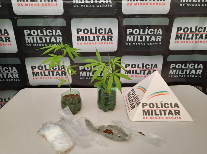 No local, os militares apreenderam dois pés de maconha, um invólucro plástico contendo substância análoga, 01 invólucro contendo sementes e várias sacolinhas de chup-chup, possivelmente utilizadas para a dolagem do produto. Com a chegada da PM, o autor evadiu do local rumo a uma lavoura de café. Ele não foi encontrado, mas foi identificado e responderá pelo crime de tráfico de drogas. Todo o material foi entregue na Delegacia de Polícia Civil em Divino.