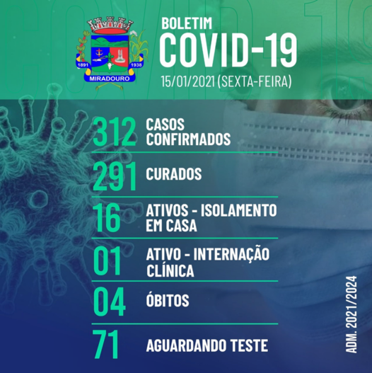 A Prefeitura de Miradouro, por meio da Secretaria Municipal de Saúde, informa o boletim epidemiológico, desta sexta-feira (15/01/2021).