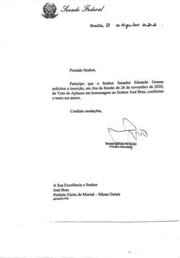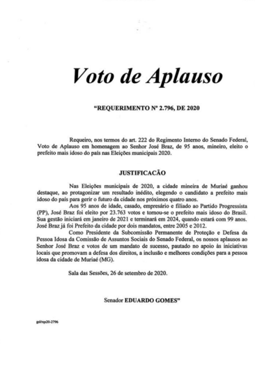 O senador Sérgio Petecão, primeiro-secretário do Senado Federal, enviou ofício ao prefeito José Braz informando-o que o senador Eduardo Gomes solicitou a inserção em Ata da Sessão de 26 de novembro de 2020, o Voto de Aplauso em homenagem por ser eleito, aos 95 anos de idade, como o prefeito mais idoso do País, nas eleições municipais do ano passado.