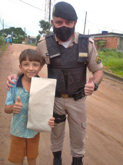 Agradecido com o presente o garoto disse que sonha em ser policial quando crescer.