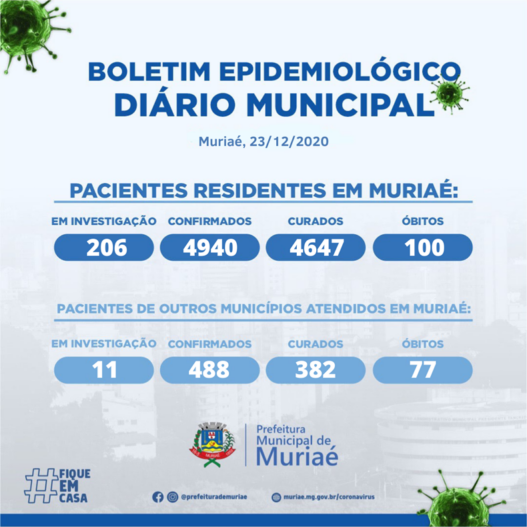 O boletim de hoje também trouxe a confirmação de mais 63 infecções por coronavírus em Muriaé. Foi o terceiro dia seguido com mais de 60 novos casos diários registrados na cidade.