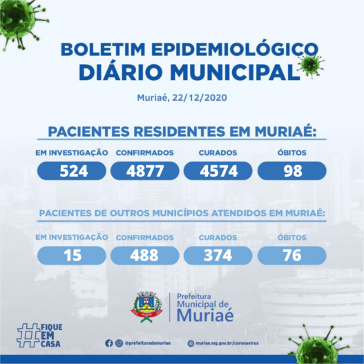 O boletim de hoje também registrou 65 novas infecções por coronavírus entre os muriaeenses. Agora a cidade está com 205 pacientes ativos da covid-19; além destes, existem ainda outras 38 pessoas que residem em outros municípios, mas foram ou ainda estão sendo atendidos em instituições de Muriaé.