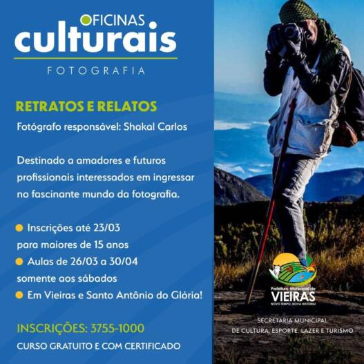 A Prefeitura de Vieiras, por meio da Secretaria Municipal de Cultura, Esporte, Lazer e Turismo, oferece pela primeira vez para os moradores de Vieiras e Santo Antônio do Glória, Oficinas Culturais. O lançamento do projeto será com uma Oficina de Fotografia, ministrada pelo fotógrafo Shakal Carlos.