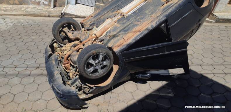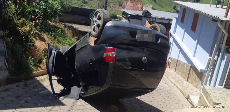 Um carro ficou com as quatro rodas para cima em um acidente na área urbana de Miradouro, na manhã desta quarta-feira (09-03). Segundo informações, a motorista teria perdido o controle do carro, ao fazer uma curva na Rua Vereador Zizi Mafra para descer na Rua Capitão Antônio Bernardino (Rua do Lions), passando por cima do meio fio, capotando e batendo contra um veículo Fiat Uno estacionado.