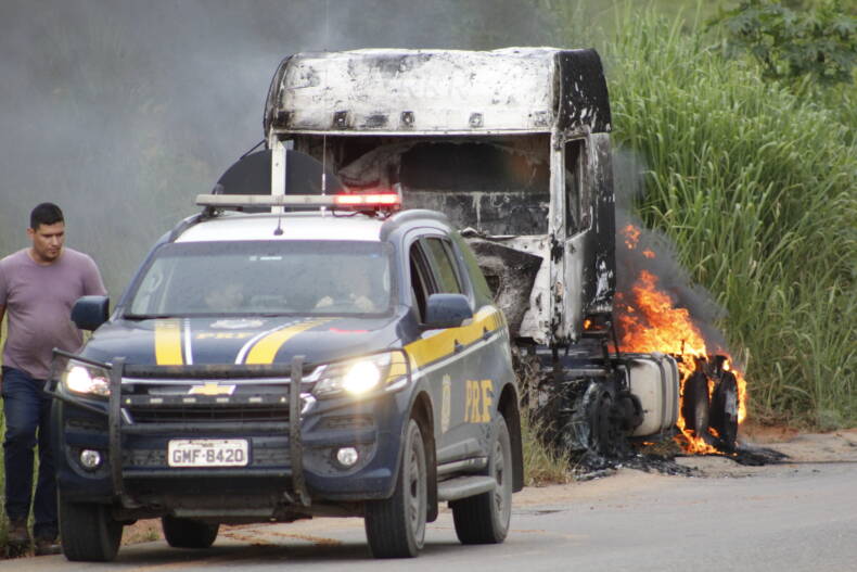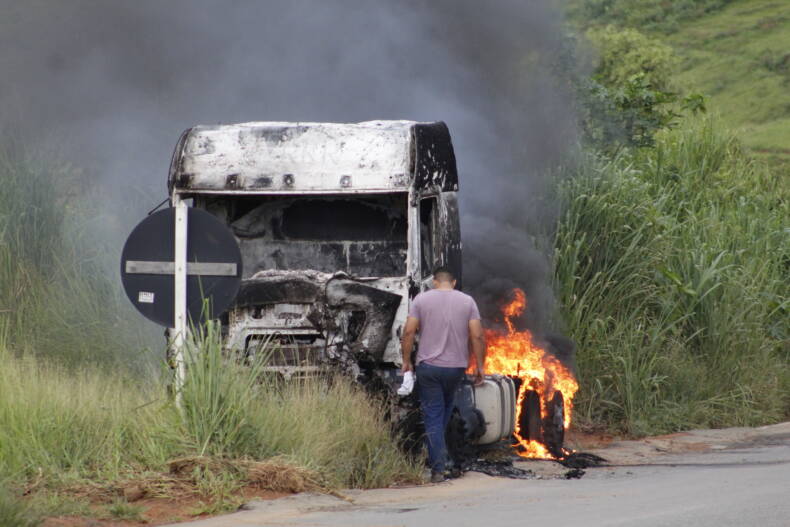 O caminhão ficou totalmente destruído pelo fogo