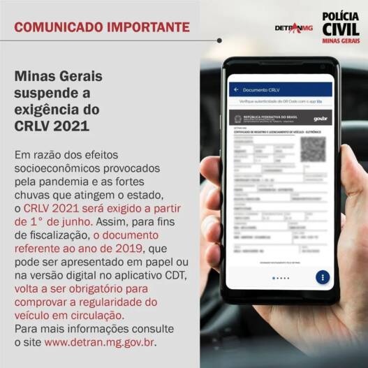 Em razão dos efeitos socioeconômicos provocados pela pandemia e as fortes chuvas que atingem todo o estado, o documento será exigido a partir de 1° de junho. Minas Gerais suspendeu a exigência do Certificado de Registro e Licenciamento de Veículo (CRLV) referente ao ano de 2021. Com a medida, o documento que estava sendo exigido nas fiscalizações de trânsito desde 1° de janeiro de 2022, passará a ser obrigatório a partir de 1° de junho.