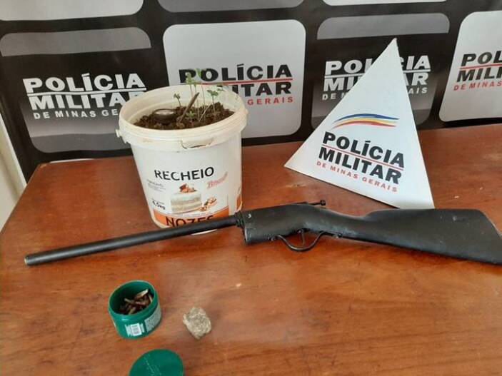 Os policiais militares lotados em Miradouro, deslocaram até uma residência situada no distrito de Santa Bárbara, onde lograram êxito em localizar 07 pés de maconha plantados em um balde; uma espingarda calibre 36; um tablete de maconha e 13 “pontas” de maconha.