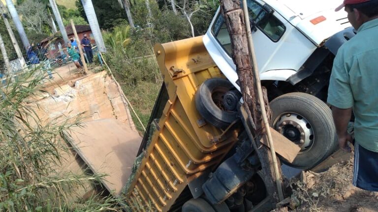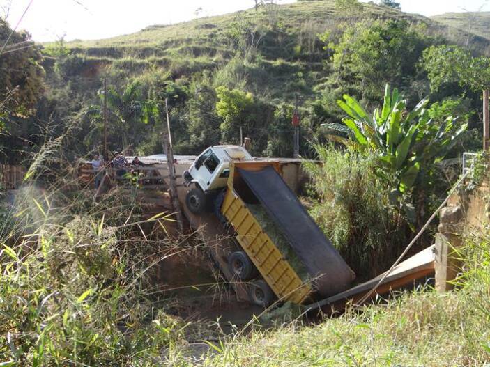 Uma ponte provisória em forma de prancha sobre o Córrego São Bartolomeu, na região do Rio Preto, a 7 Km de Muriaé, desabou por volta das 14 horas desta quinta-feira (8), quando um caminhão carregado de capim passava sobre ela. O veículo ficou de pé. A carga saiu de Muriaé e iria para a região da Usina.