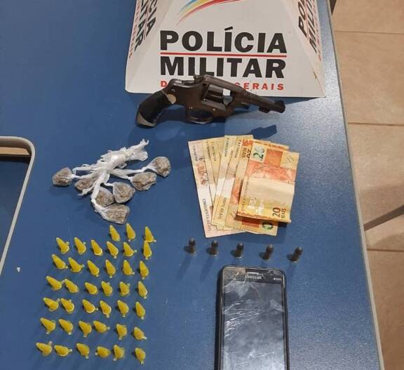 Com o menor foram encontrados na cintura 01 (um) revólver calibre .32; 05 (cinco) munições calibre .32; 39 (trinta e nove) pinos de cocaína; 07 (sete) buchas de maconha e R$ 170,00 em dinheiro.