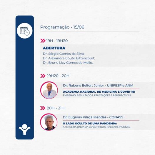 - 19h20 – Academia Nacional de Medicina e COVID-19: empenho, resultados, frustações e perspectivas – Dr. Rubens Belfort Junior (UNIFESP e ANM)
