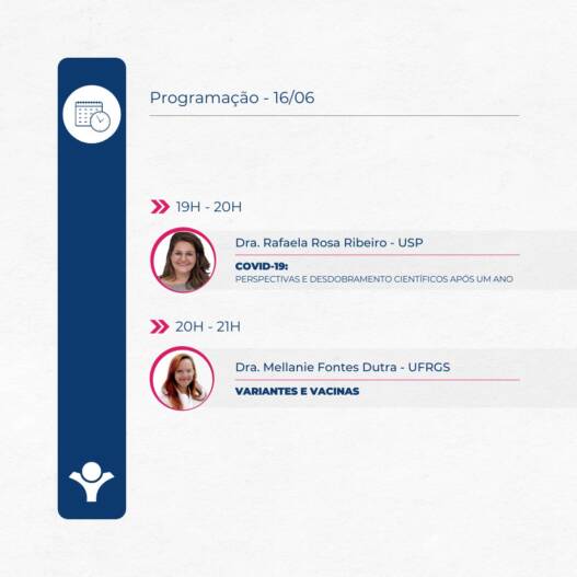 - 19h – COVID-19: perspectivas e desdobramento científicos após um ano – Dra. Rafaela Rosa Ribeiro (USP)
