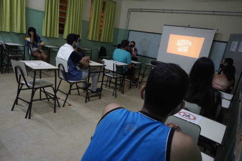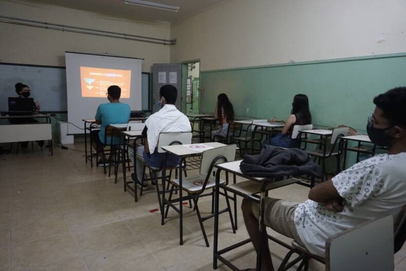 As aulas acontecem às quintas-feiras para quatro grupos, cada um formado de quatro pessoas, respeitando às condições de distanciamento impostas pelo período de pandemia. Duas aulas são on-line, via Google Meet, e outras duas presenciais na Escola Estadual Themistocles Eutrópio.