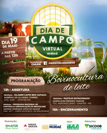 O Dia de Campo Virtual – Bovinocultura do Leite será na próxima quarta-feira (19), às 13 horas, em forma de ‘Live’ no Facebook da Prefeitura de Muriaé. O evento é uma parceria da Secretaria Municipal de Agricultura e Meio Ambiente e Emater-MG. A programação cumpre os protocolos da pandemia e leva para os pecuaristas as mais importantes técnicas de manejo do gado. A região é referência nesta atividade agropecuária.