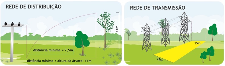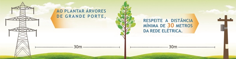 Para árvores de grande porte, como o eucalipto, a distância mínima é de 30 metros da rede ou a altura da árvore na fase adulta.