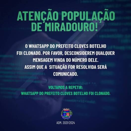 Atenção população de Miradouro! O número de telefone e de WhatsApp do Prefeito Cloves Botelho foi clonado.