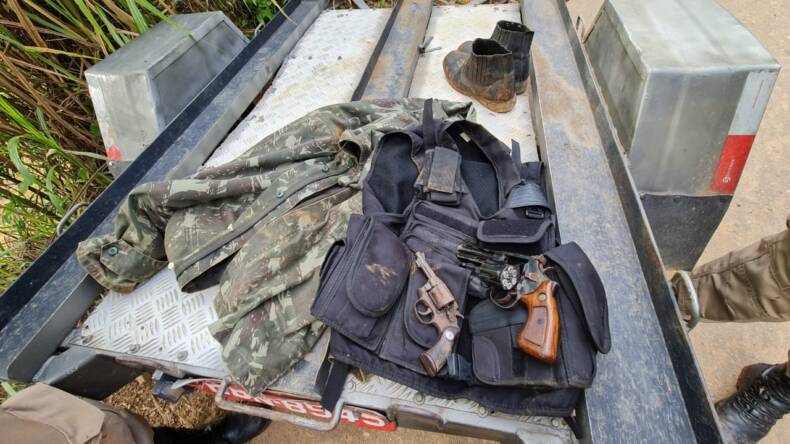 PM ENCONTRA COLETE E REVÓLVERES ABANDONADOS PELO AUTOR DO ROUBO DE GADO E FORAGIDO NA MATA EM PIRAPANEMA