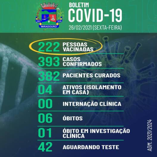 A Prefeitura de Miradouro, por meio da Secretaria Municipal de Saúde, informa o boletim epidemiológico, desta sexta-feira (26/02/2021).