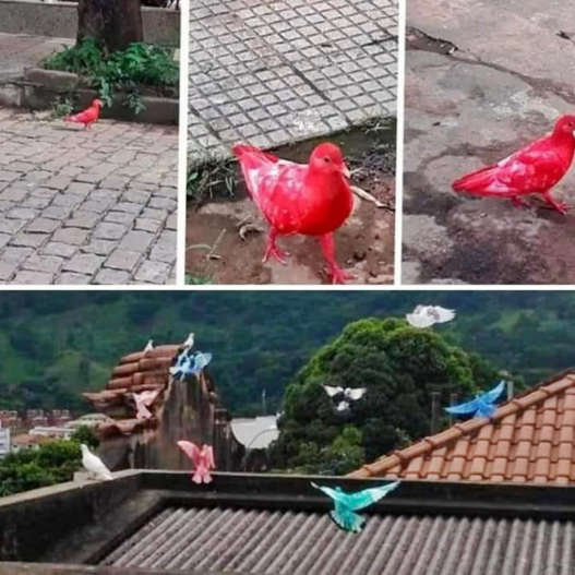 Vários pombos apareceram com cores que provam que foram “tingidos” e vira caso de polícia em Leopoldina MG. A Prefeitura informou que a Policia Militar do Meio Ambiente foi acionada para investigar no objetivo de encontrar quem “tingiu” os pombos.