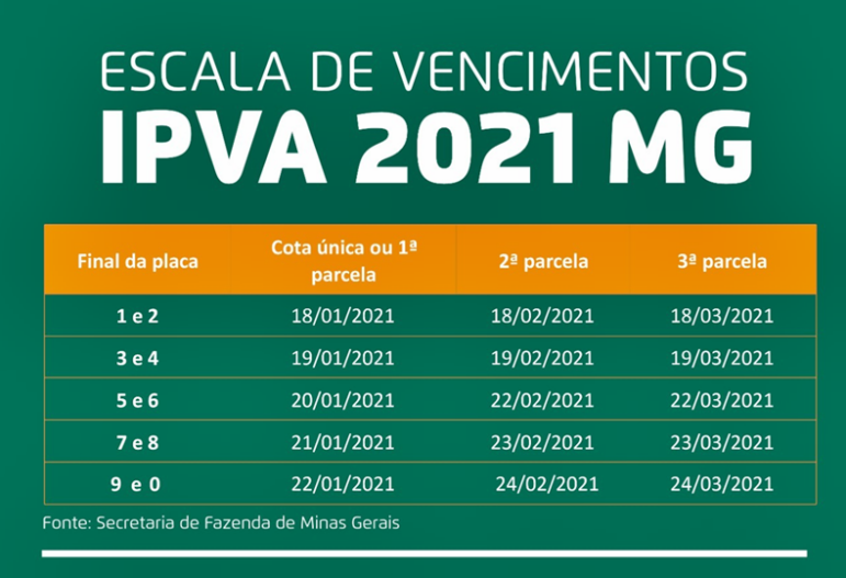 CALENDÁRIO DE PAGAMENTO DO IPVA 2021 EM MINAS VAI DE 18 DE JANEIRO A 24 DE MARÇO